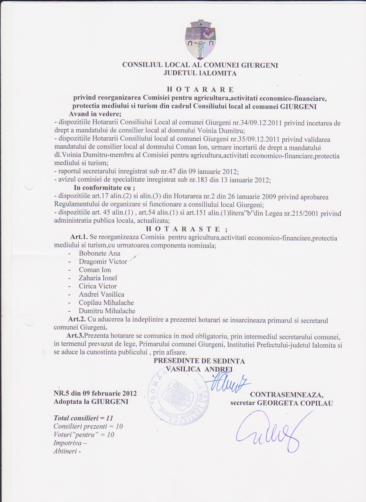 - Hot. nr. 5/09.02.2012 privind reorganizarea Comisiei pt. agricultura, activitati economico-financiare, protectia mediului si turism, din cadrul C.L. al comunei Giurgeni, jud. Ialomita.