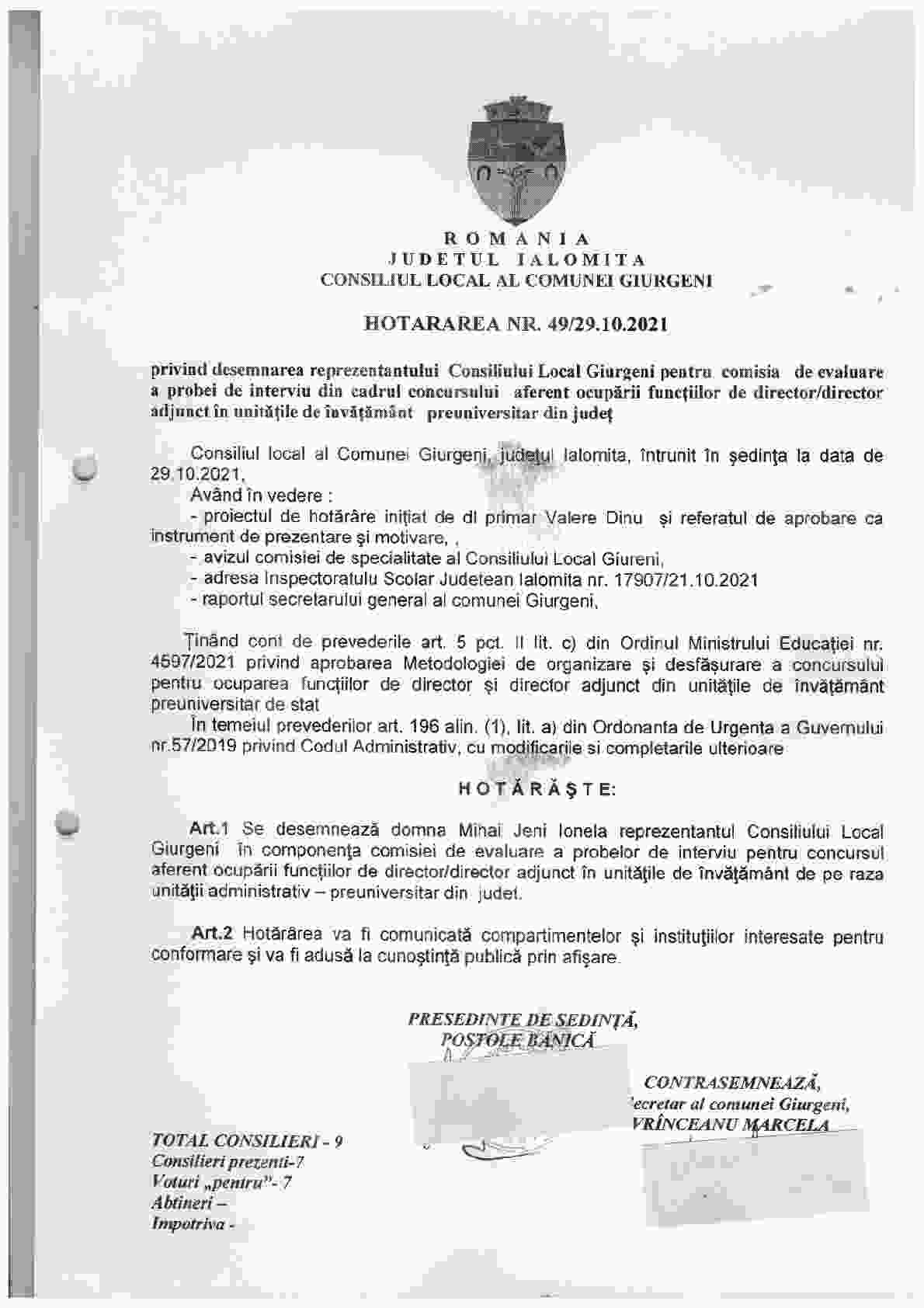 - Hot. nr. 005/27.07.2012 privind alegerea Viceprimarului comunei Giurgeni, jud. Ialomita.