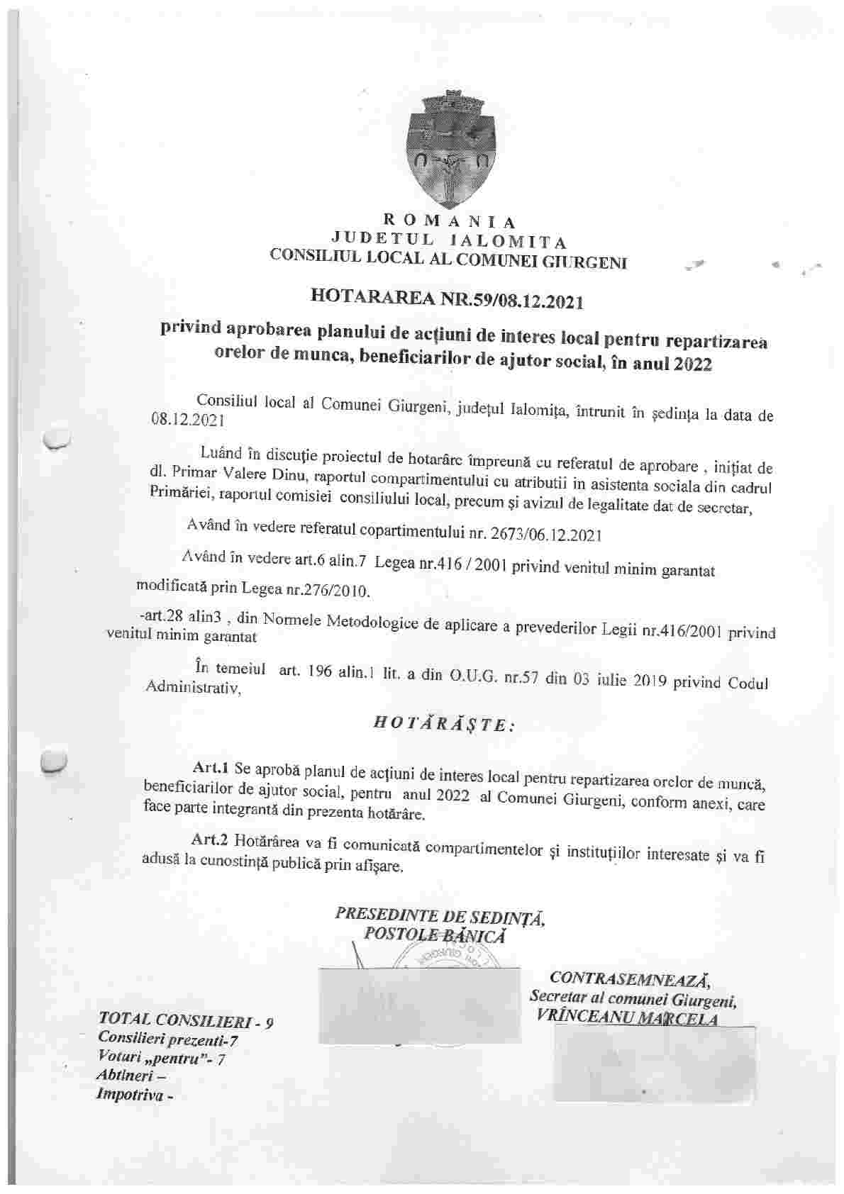 - Hot. nr. 1/11.01.2012 privind alegere presedintelui de sedinta al C.L. Giurgeni, jud. Ialomita.
